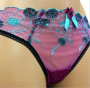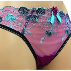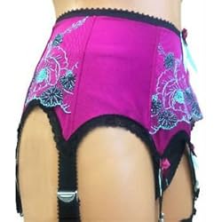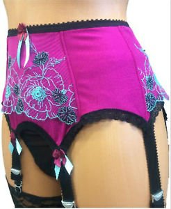 Renne, lace suspender/garter belt. Brand new for spring 2014new collection by english designer elaine edwards see it here first. Made from lycra in a deep cerise, the colour of ripe rasberry, 3 panels of embroidered floral lace overlaid in complimentary shades of navy and turquoise, 12mm wide picot edged waist elastic, rear 3 row, 3 deep metal hook and eye fastening, tiny lace edge trim in black, 19mm wide suspender straps with all metal clips and adjusters, satin ribbon and bow detail in plum and turquoise. To match this fine under pining is a matching thong sold seperately .. Brand new and british made.