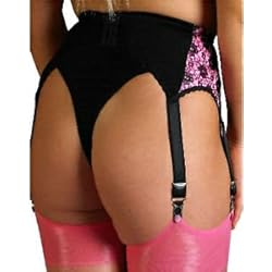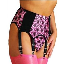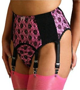 Pink triple lace 6 strap suspender belt. Exotic and teasing, sensually pleasing. 3 panels of candy pink overlaid with deepest black lace. Vintage style offering maximum coverage. 19mm wide enclosed waist elastic. Rear 3 row, 3 deep metal hook and eye closure for the ulltimate adjustment. 6 snappy suspender straps with metal regulators and clips. Black lace trim and tipped with a pale pink organza bow. A 50’s siren must have !!!