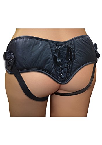 Black soft PVC vegan leather Lace-up corset-style back 4-way adjustable straps fits size 12 to 30 Accommodates dildos with a flared base (Dildo not included) Includes interchangeable metal O-rings: 1.5″ (3.8cm), 2″ (5cm) Includes channel for bullet vibrator (Sold separately) Individually sewn hooks on Corsette back Handcrafted in the USA Clean with damp, soft cloth