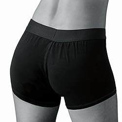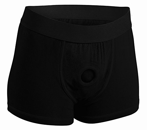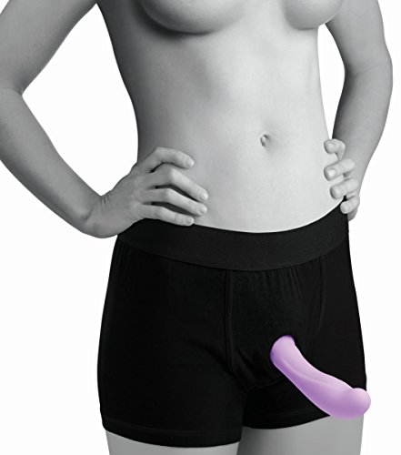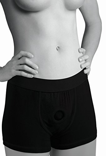 Feel more comfortable and stylish than ever before when you strap on your favorite dildo. This boxer brief style harness feels just like underwear, with an O-ring that stretches to accommodate most dildo sizes. You can even wear these cotton shorts out under your clothing, or stuff them with your favorite packer. This harness is excellent for extended wear. The supportive elastic waistband will carry the weight of your dong and you will be allowed greater mobility and position versatility. This harness is recommended for use with dildos that have a flat base that is 1.75 inches or wider. Machine washable. Measurements: Waistband measures 15 inches in diameter, unstretched. Legs of shorts are 10 inches in length, unstretched. O-ring is 1.5 inches in diameter, unstretched. Material: Cotton, spandex, rubber. Color: Black. Note: Dildo not included.