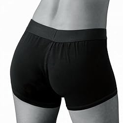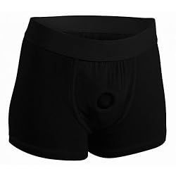 Feel more comfortable and stylish than ever before when you strap on your favorite dildo. This boxer brief style harness feels just like underwear, with an O-ring that stretches to accommodate most dildo sizes. You can even wear these cotton shorts out under your clothing, or stuff them with your favorite packer. This harness is excellent for extended wear. The supportive elastic waistband will carry the weight of your dong and you will be allowed greater mobility and position versatility. This harness is recommended for use with dildos that have a flat base that is 1.75 inches or wider. Machine washable. Measurements: Waistband measures 13 inches in diameter, unstretched. Legs of shorts are 9.5 inches in length, unstretched. O-ring is 1.5 inches in diameter, unstretched. Material: Cotton, spandex, rubber. Color: Black. Note: Dildo not included.