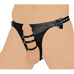 This thong-style leather harness has three straps to keep his erection in check! Both the thong back and the buckled waist band of the harness can be adjusted for fit and are lockable for extra security. The three straps for the penis are lined with suede for comfort and are also adjustable to suit your level of torment. Measurements: Waist adjusts from 29 to 35 inches in circumference; Rear thong strap adjusts from 8.5 to 11 inches in length, Material: Leather, metal, Color: Black, Note: Locks for the three locking buckle straps are sold separately